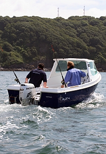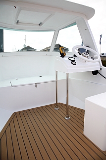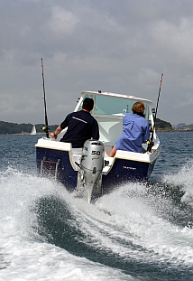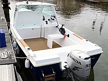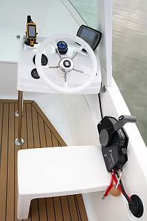 The Pilot4 offers maximum versatility as an all-round boat with an impressive performance. Her remouvable cuddy is perfect if you enjoy a lot of different activities, fishing, water-skiing, diving, bathing or just pottering around. At slow displacement speeds the Pilot4 tracks well and is very maneuverable, so whether you are trolling for fish or exploring rivers you can be assured a relaxing time. But apply the throttle and the Pilot4 eases onto the plane giving you the performance you would expect from a conventional sports boat. When onboard you have the space and feeling of a much larger boat with plenty of storage and seating. The high internal freeboard is perfect for smaller children, with the cuddy providing a safe haven even on those colder days. She has been designed with practicality and seaworthiness in mind, combining style and purposefulness, the Pilot4 is without exaggeration, The layout has been kept simple and practical, with large lockers forward and aft providing ample storage and seating. The steering console and helm seat have been positioned amidships to starboard keeping the majority of the deck open and versatile. An optional port side seat is also available. The removable cuddy is mounted forward with a rooftop hatch giving safe access to the foredeck when mooring and anchoring. This arrangement gives exceptional levels of visibility through the cuddy generally not found on many other similar boats. The hull is of a medium ‘V’ type with a deep forefoot creating fine sections forward that slice through choppy seas. Spray and chine rails improve performance and deflect spray down and away from the boat keeping her dry even if conditions deteriorate. The hull has a deadrise of 15 degs. aft and plenty of beam to support the larger and heavier 4-stroke outboards. The Pilot4 is manufactured from GRP, with the hull reinforced by an internal girder system linking the hull and deck mouldings, producing a very strong and rigid structure, all GRP materials being Lloyds approved or equivalent. The keel is double laid and the transom is reinforced with marine plywood and supported by the girder system to take the engine loadings. The full deck moulding incorporates a non-slip finish with additional structure in way of each deck fitting.